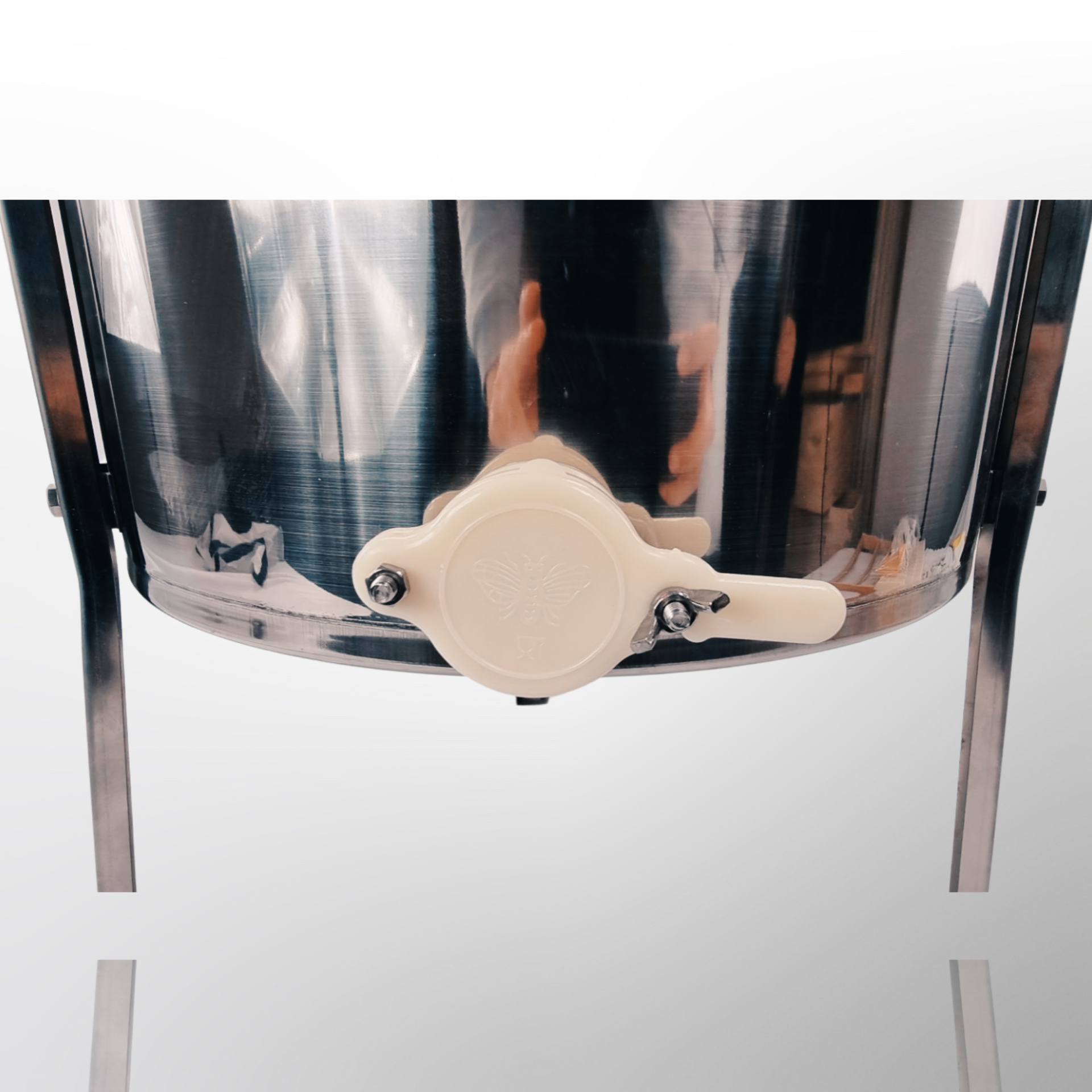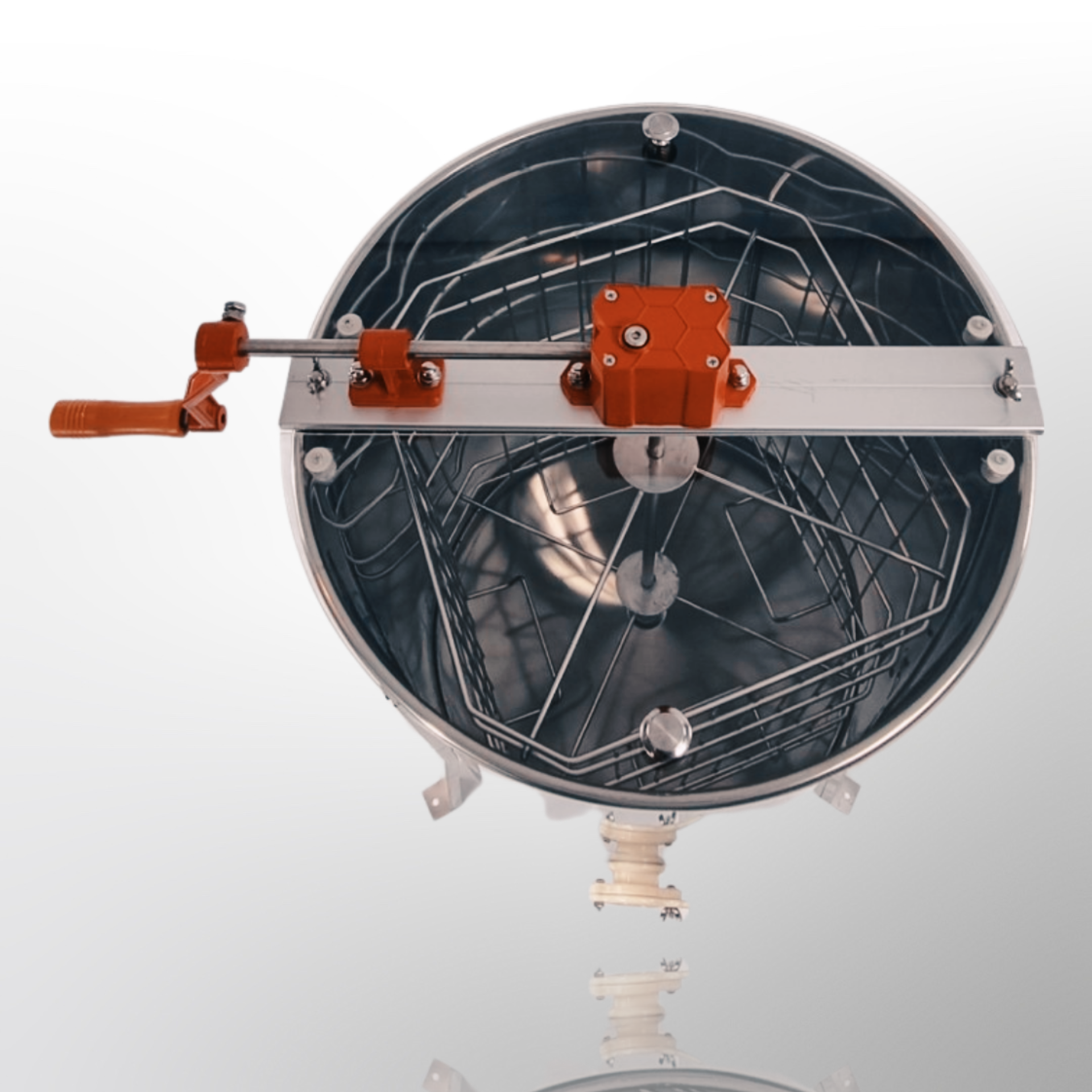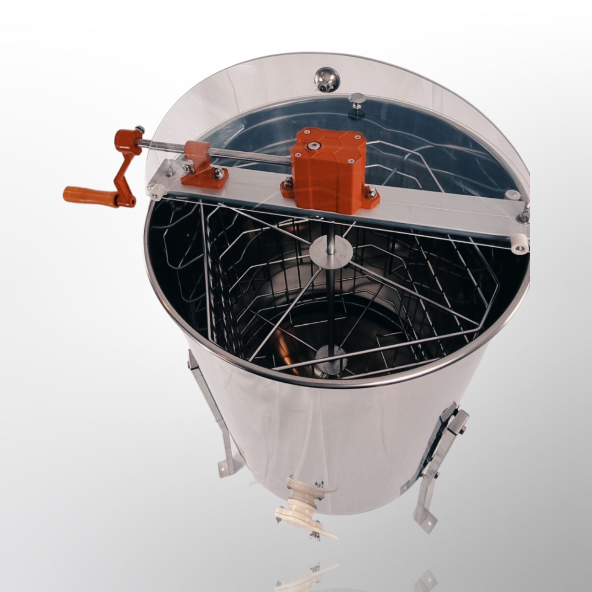 - Conical shaped inside bottom and raised bottom bearing keep honey separate from the extractor.