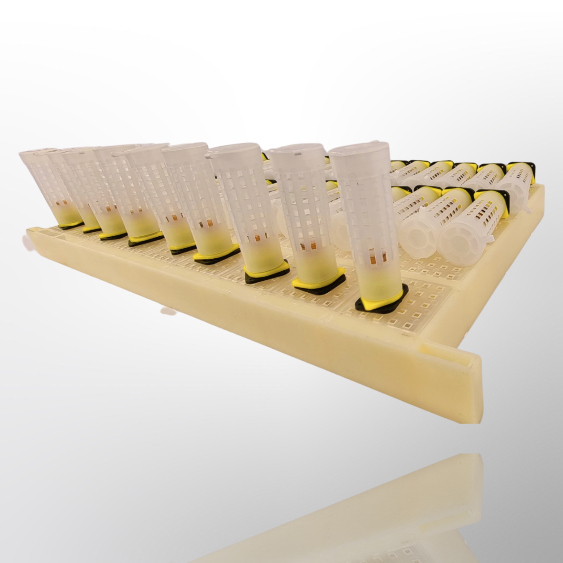 - This plastic frame is designed to accommodate 45 individual queen cells, providing ample space for successful queen bee production.